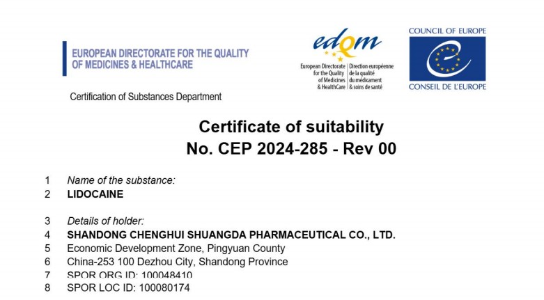 2025年10月9日,我公司原料药利多卡因欧洲CEP注册获批,并已收到欧洲药品质量管理局(EDQM)颁发的欧洲药典适用性证书(CEP证书)。